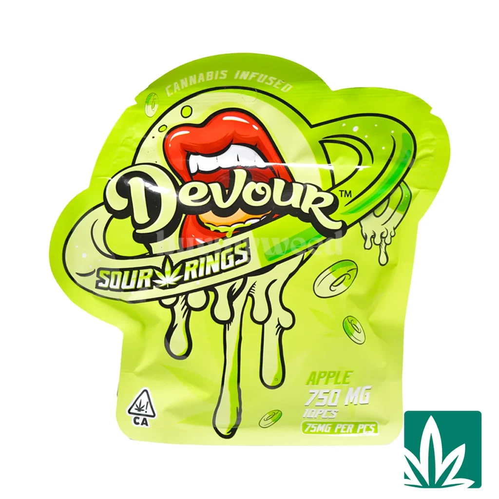Devour Edibles – Sour Rings (Apple) delivers a crisp and tangy cannabis experience with the classic taste of sour apple gummy rings. Infused with 750mg of THC per pack, these chewy edibles offer a sweet-and-sour punch and a reliable, long-lasting high.